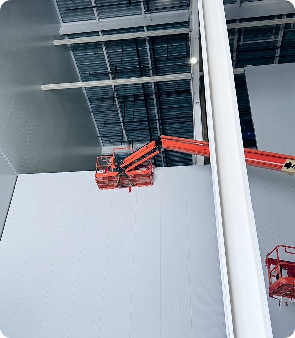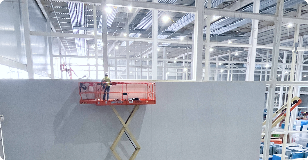 Site logistics and coordination planning are two other essential elements that Precision Environments provides during the construction phase of gigafactory projects. Projects of this scale require significant coordination between multiple contractors working simultaneously to achieve the same goal. Significant coordination and planning are needed throughout the preconstruction phase and BIM (Building Information Modeling) technology. There are many challenges surrounding the handling of such large panels that are used for gigafactories. Special equipment and lifts are required for handling panels that can weigh over 1000lbs each and are over 40 feet long. Often, such large panels need to be installed in difficult locations where lift access is limited. Panels are shipped in large bundles that are moved to the site. Panels often need to be lifted to the second or third levels of gigafactories depending on the design. Precision Environments ensures that site installers receive training from the lift equipment manufacturers of this special vacuum-lift equipment and also provide consultation and coordination with the interior metal panel manufacturers.